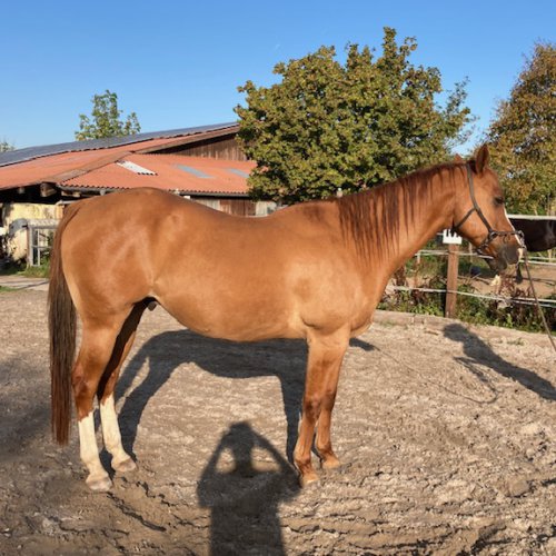Im September 2023 war es aber dann so, dass die Vorbesitzerin ihn verkaufen wollte (musste) und es tat uns allen leid, dass er nun aus der stabilen Stiuation in der Herde raus sollte. Und da mein Mann sich immer sehr um andere sorgt, bat er mich ihn zu kaufen, weil ich mich mit Biomechanik, Gymnastizierung und Traumata sowie Ängsten beschäftige. Eigentlich war es mir zu viel. Aber, was soll ich sagen, er hatte mich überzeugt. Seitdem habe ich drei Pferde und er der neue ist eine Quarterhorse und heißt Coosa!